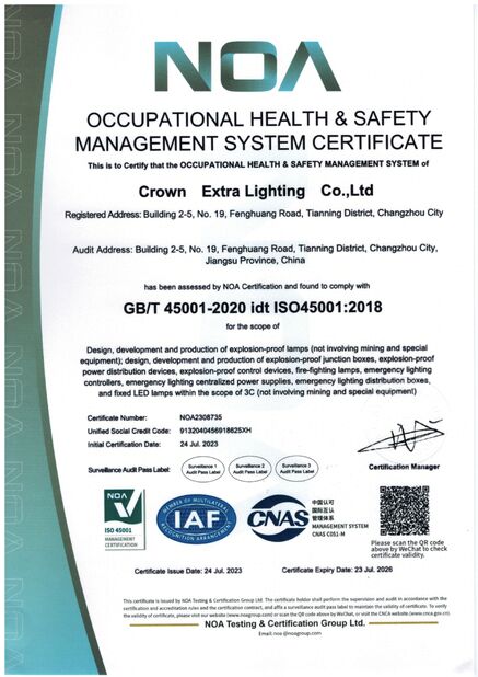 पीपुल्स रिपब्लिक ऑफ चाइना के GB3836.1 / GB3836.2-2010 राष्ट्रीय विस्फोट प्रूफ मानक के अनुसार, कंपनी ने राष्ट्रीय प्रकाश गुणवत्ता पर्यवेक्षण और निरीक्षण केंद्र का प्रदर्शन परीक्षण पास किया है और विस्फोट प्रूफ प्रमाणपत्र और परीक्षण रिपोर्ट प्राप्त की है; बाद में, इसने प्रबंधन प्रणाली प्रमाणन जैसे EU ATEX प्रमाणन, ISO9001: 2008, RoHS प्रमाणन और उत्पादन लाइसेंस प्राप्त किया है। कंपनी उन्नत विनिर्माण उपकरण और परीक्षण उपकरण से लैस है, एक उच्च योग्य और अनुभवी आर एंड डी तकनीकी टीम और प्रबंधन टीम है, उद्यम प्रबंधन, उत्पाद डिजाइन, प्रक्रिया गुणवत्ता नियंत्रण और प्रतिक्रिया के लिए प्रबंधन प्रणाली के अनुसार, प्रभावी ढंग से सुनिश्चित करता है विस्फोट प्रूफ एलईडी लाइटिंग और सेवाओं की गुणवत्ता।