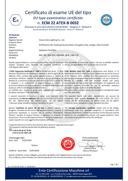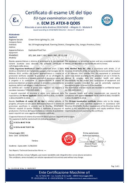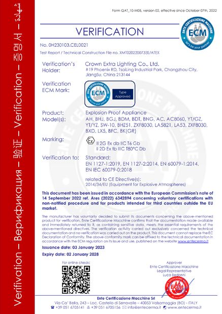 मानक:ATEX संख्या:ECM 24 ATEX-D QS01 मुद्दा तिथि:2024-08-06 समाप्ति दिनांक:2027-08-05 |